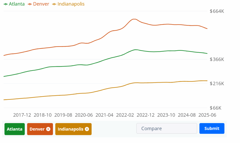 Actual property is hyper native. Have a look at Denver and Atlanta, if you’re in these markets, you might be much less optimistic on the actual property market as values are falling off their peaks. On the flip aspect if you’re in Indianapolis costs are nonetheless rising and sellers are seemingly a lot happier than in Denver or Atlanta.